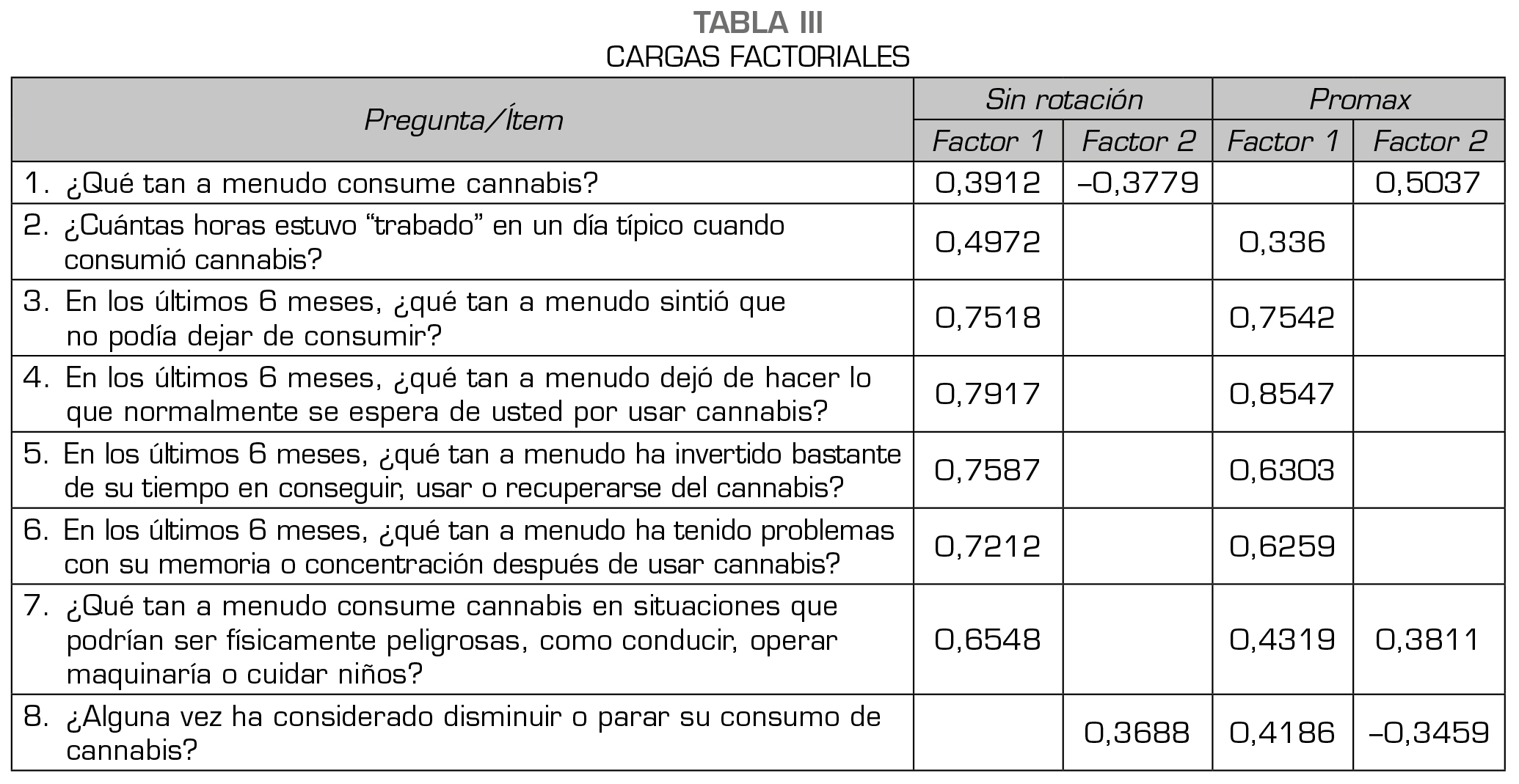 El factor 1 contiene las preguntas que hacen referencia a deseos de consumir, tiempo para recuperarse, afectación en actividades diarias, alteración en la memoria, y participación en situaciones de riesgo; en el factor 2 se observan preguntas relacionadas con la frecuencia de consumo y la intención de detenerse. Se realiza rotación promax para ver si es posible dar otra interpretación a estas cargas factoriales; los resultados están en la Tabla 3.