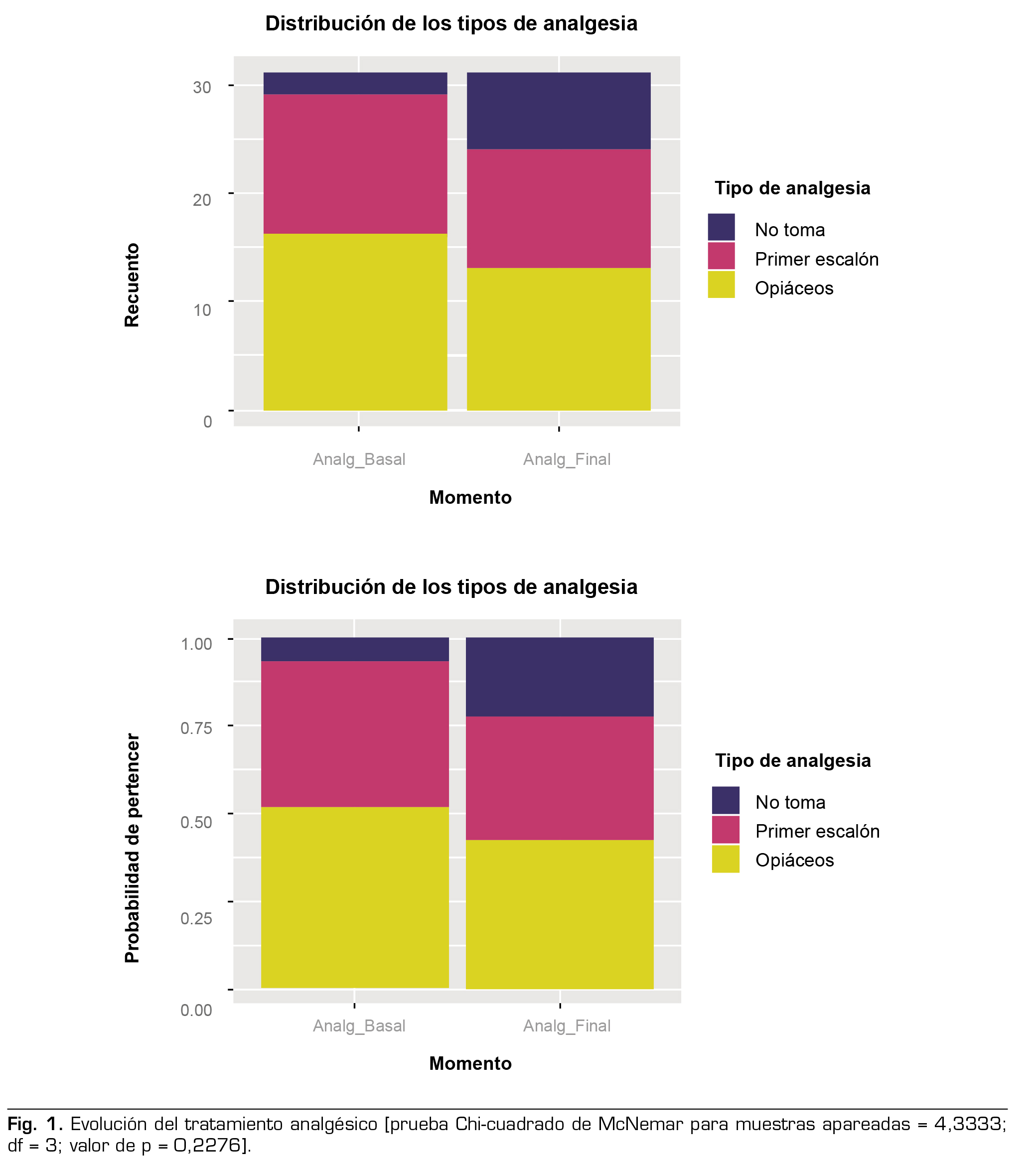 Resultados: Todos los pacientes presentaron mejoría en las escalas EVA y WOMAC tras cada una de las inyecciones de PRP, siendo estadísticamente significativa en la semana 9 (3ª inyección). Objetivamos que, de manera estadísticamente significativa, los pacientes obesos tienen una peor evolución del resultado del tratamiento. Se produjo un cambio en la distribución porcentual de las modalidades de tratamiento analgésico, aunque este cambio no alcanzó significación estadística. La duración del efecto del tratamiento tuvo una mediana de 8 meses [P25: 4 meses; P75: 13 meses] (IC 95 % de la media = 6,78 a 11,61) después de la última infiltración.