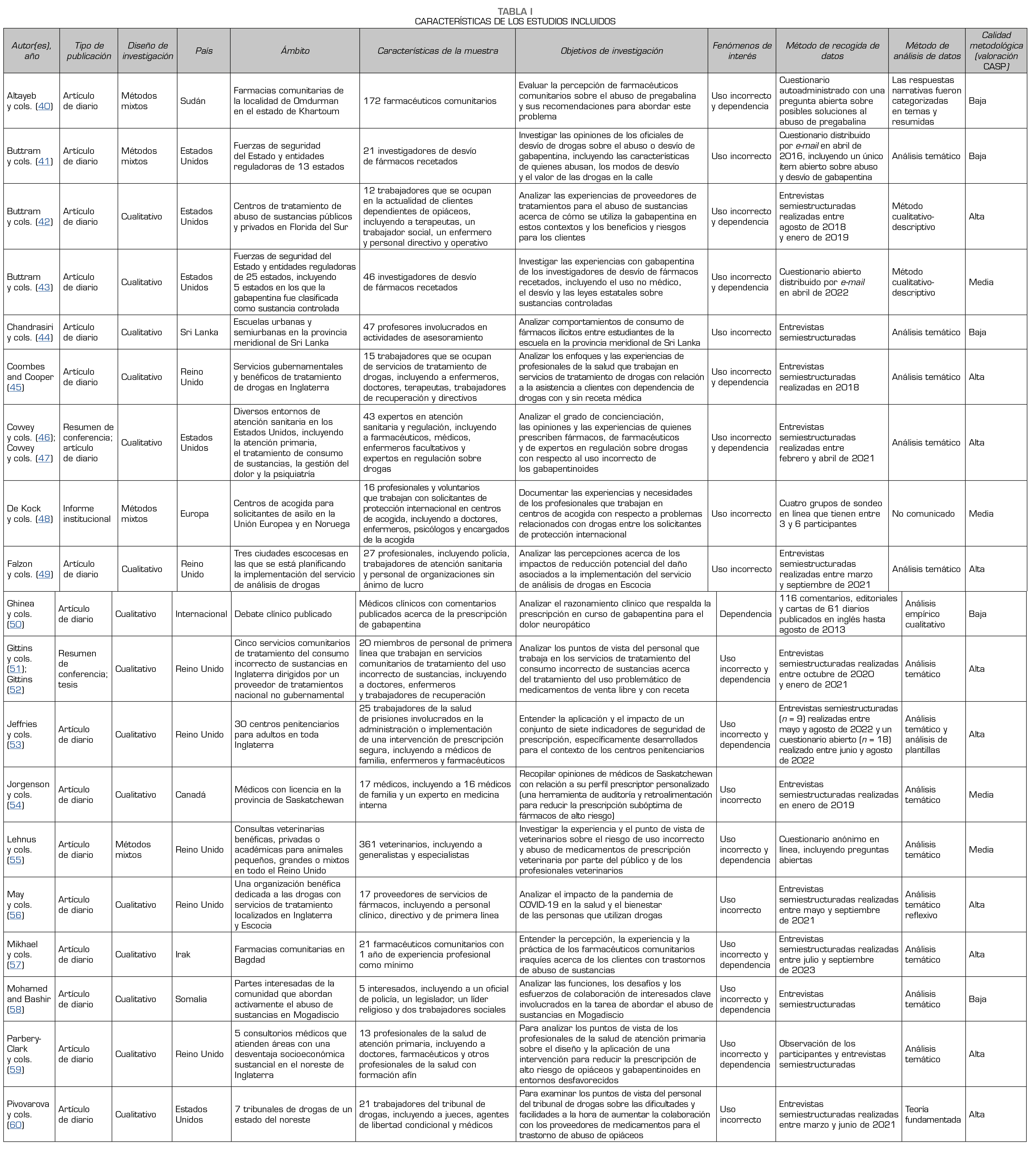Bases de datos y tratamiento de los datos: Se ha trabajado buscando en seis bases de datos (MEDLINE, Scopus, Web of Science, CINAHL, EMBASE, PsycINFO) hasta mayo de 2025. Los estudios aptos utilizaron métodos cualitativos o mixtos para analizar los enfoques profesionales sobre el uso incorrecto o la dependencia de los gabapentinoides. Los estudios centrados únicamente en el punto de vista de los pacientes o en el uso terapéutico fueron excluidos. La calidad metodológica se evaluó empleando la lista CASP (Critical Appraisal Skills Programme). Los datos se analizaron utilizando la síntesis temática, y se evaluó la confianza en los hallazgos usando GRADE-CERQual.