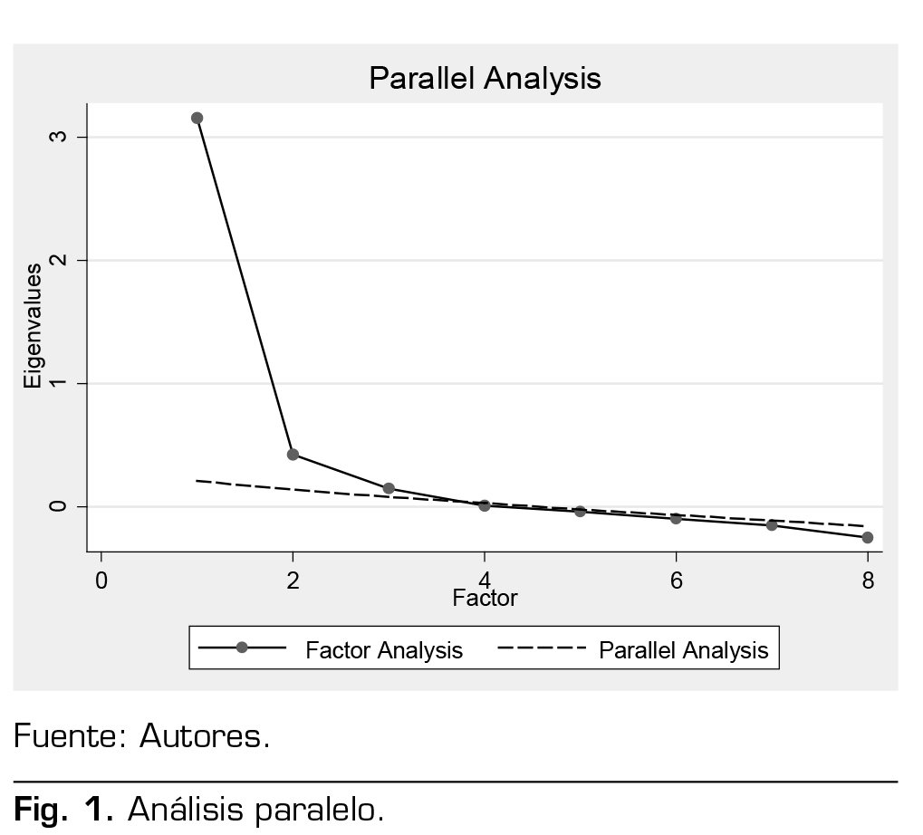 Para dar inicio a la validación de la escala, se evalúa la prueba de Kaiser-Meyer-Olkin, encontrando un valor de 0,809, y un test de esfericidad de Barlett con p < 0,05; de esta forma, se prueba que las variables de la escala están correlacionadas y son adecuadas para realizar un análisis factorial exploratorio. Los resultados de dicho análisis se encuentran en la Tabla 2.