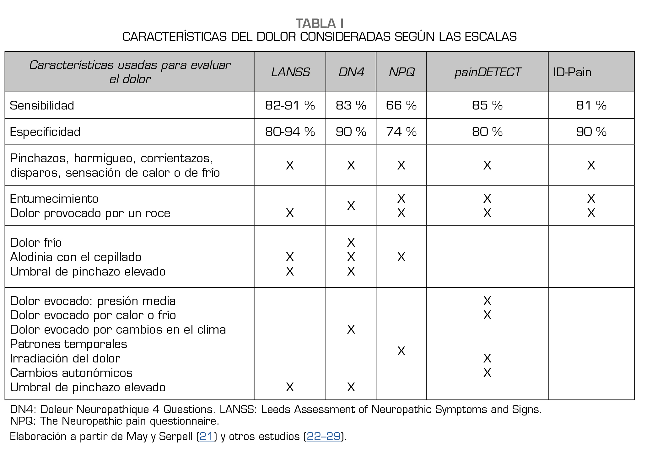 La guía de NEUPSIG para el diagnóstico del dolor neuropático sugiere algunas herramientas de evaluación como el The Leeds Assessment of Neuropathic Symptoms and Signs (LANSS) que consta de 5 ítems de síntomas y 2 de examen físico, y de una escala de LANSS autorreportada, con una sensibilidad del 82-91 % y una especificidad del 80-94 % (22,23,24). La escala The Neuropathic pain questionnaire (NPQ) es una escala de 12 ítems, 10 de ellos describen síntomas y 2 están relacionados con el afecto: esta es útil al ayudarnos a diferenciar un dolor neuropático de uno que no lo es, cuenta con una sensibilidad del 66 % y una especificidad del 74 % (25). Otra escala es Doleur Neuropathique 4 Questions (DN4), consta de 10 ítems, 7 sobre síntomas y 3 con base en el examen físico, un puntaje de 4 a 10 indica dolor neuropático, cuenta con una sensibilidad del 83 % y una especificidad del 90 % (26). La escala painDETECT fue desarrollada en Alemania, consta de 9 ítems y no requiere de examen físico, cuenta con una sensibilidad del 85 % y una especificidad del 80 % (27). Y el ID-Pain es una escala con 5 descriptores sensoriales del dolor y un ítem relacionado con si el dolor se ubica en las articulaciones, no requiere examen físico y su propósito es identificar si el dolor tiene un componente neuropático, siendo su punto de corte ≥ 3 (28,29).
