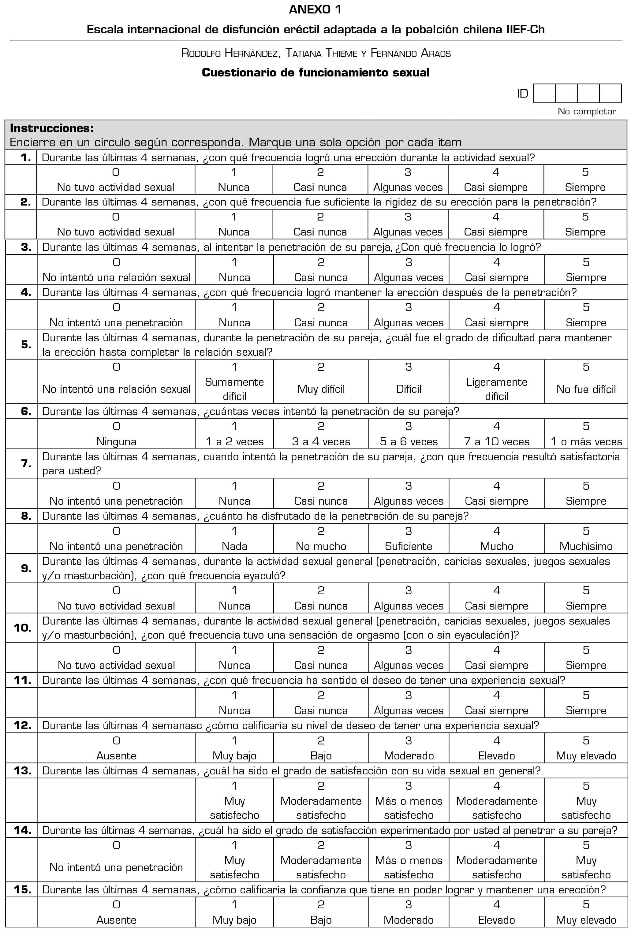 15. Hernández R, Thieme T, Araos F. Adaptación y Análisis Psicométrico de la Versión Española del Índice Internacional de Función Eréctil (IIEF) en Población Chilena. Terapia psicológica. 2017;35(3):223-30.