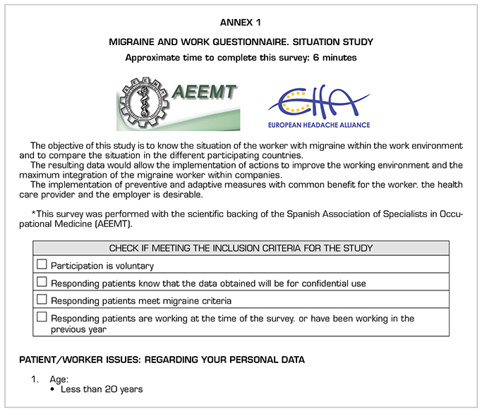 A cross-sectional observational study based on an anonymous web-based survey located on the European Migraine and Headache Alliance (EMHA) website and scientifically endorsed by the Spanish Association of Specialists in Occupational Medicine (AEEMT) to 3342 patients in Spain. Italy. France. Portugal. Ireland. United Kingdom. Germany and other countries of the European Union. A previous diagnosis of migraine. be working at the time of the survey or have been working in the previous year. and participate voluntarily were considered inclusion criteria. Data were collected from September 2018 to January 2019. The survey consists of 32 questions with multiple responses (Annex 1).
