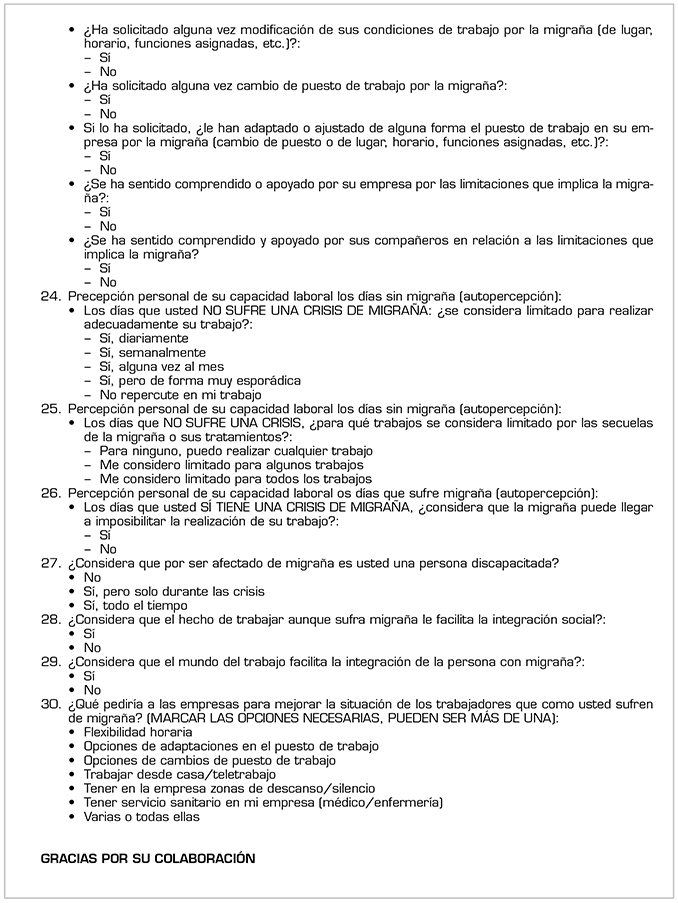 Estudio observacional transversal a partir de una encuesta anónima vía web ubicada en la página de la European Migraine and Headache Alliance (EMHA) y avalada científicamente por la asociación española de especialistas en medicina del trabajo (AEEMT) a 3342 pacientes de España, Italia, Francia, Portugal, Irlanda, Reino Unido, Alemania y otros países de la Unión Europea no incluidos entre los anteriores. Se consideran criterios de inclusión tener un diagnóstico previo de migraña, estar trabajando en el momento de la encuesta o haberlo estado en el año previo, y participación voluntaria. Se recogen datos desde septiembre de 2018 hasta enero de 2019. La encuesta consta de 32 cuestiones con respuesta múltiple (Anexo 1).