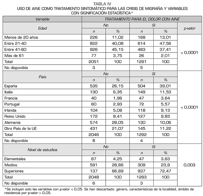 El uso de triptanes muestra relación con la edad y el género, mayor uso entre 21-60 años (p < 0,0001) y en mujeres (p < 0,0001). Por países, el mayor consumo es en Alemania, resto de países de Unión Europea, España y Reino Unido (p < 0,0001). Mayor consumo en pacientes que viven en ciudades de más de 500 habitantes (p < 0,010) y con estudios medios o superiores (p < 0,0001). En el grupo de estudios medios y superiores se encuentra por contraste el mayor porcentaje de pacientes que desconocen qué es un tratamiento sintomático (p < 0,0001).