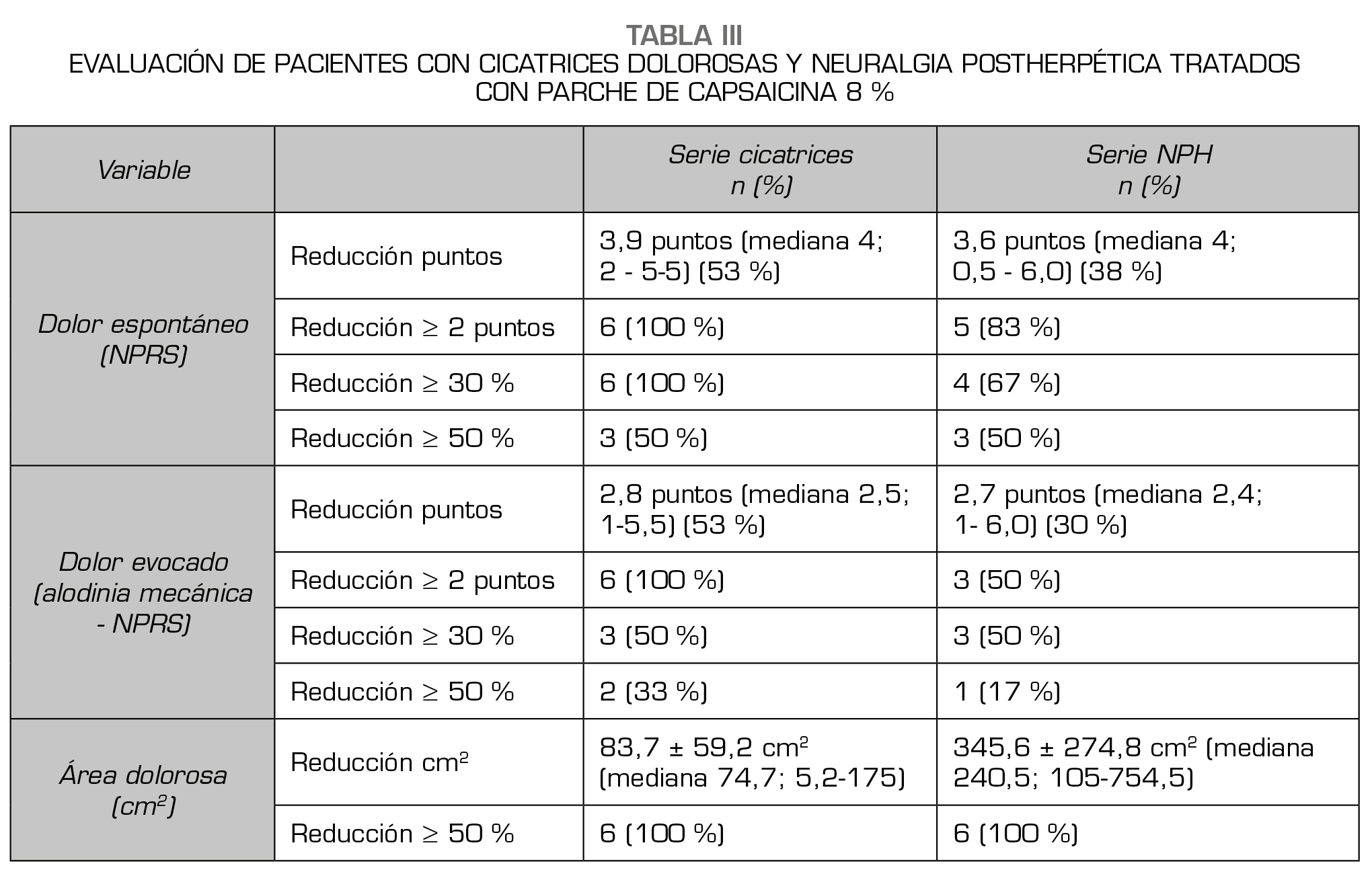 Discusión: Se sugiere que el parche de capsaicina 8 % es una opción valiosa para el tratamiento del dolor neuropático localizado, proveyendo una reducción significativa de la intensidad del dolor espontáneo, alodinia mecánica y área dolorosa. Además, reduce el consumo de fármacos orales, particularmente opioides, y mejora la calidad de vida, acompañándose de buena tolerabilidad. Esta investigación tiene limitaciones inherentes a un estudio retrospectivo e incluye un pequeño número de pacientes, por lo que sugerimos la realización de estudios prospectivos con similar metodología y población, pero con mayor tamaño muestral.