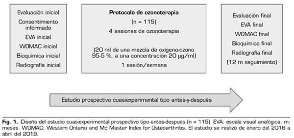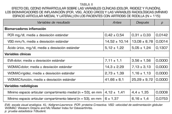 Material y métodos: Se realizó un estudio cuasiexperimental prospectivo tipo antes y después a 115 pacientes con artrosis de rodilla con Kellgren-Lawrence grado 2 o más. El protocolo de ozono consistió en 4 sesiones (una sesión/semana) de una infiltración intrarticular de 20 ml de una mezcla médica de oxígeno-ozono (95-5 %) a una concentración de 20 µg/ml. Las variables de resultado incluyeron variables clínicas (dolor, rigidez y función), bioquímicas (PCR, VSG, ácido úrico) y radiológicas (mínimo espacio articular femorotibial).