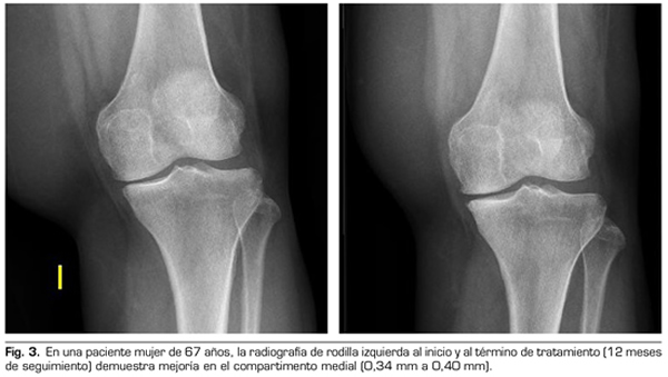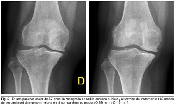 Tras un año de seguimiento con controles radio-lógicos a 53 de los 115 pacientes del estudio, el ozono (O2-O3) ha sido capaz de aumentar el mínimo espacio articular del compartimento medial (de 4,12 a 4,44 mm) y del compartimento lateral (de 6,0 a 6,16 mm), revirtiendo la artrosis de rodilla en nuestra serie de casos. Este hallazgo sugiere el efecto modificador de la enfermedad del ozono (O2-O3) sobre la artrosis de rodilla, hallazgos que coinciden con lo reportado recientemente por Fernández-Cuadros y cols. (9).