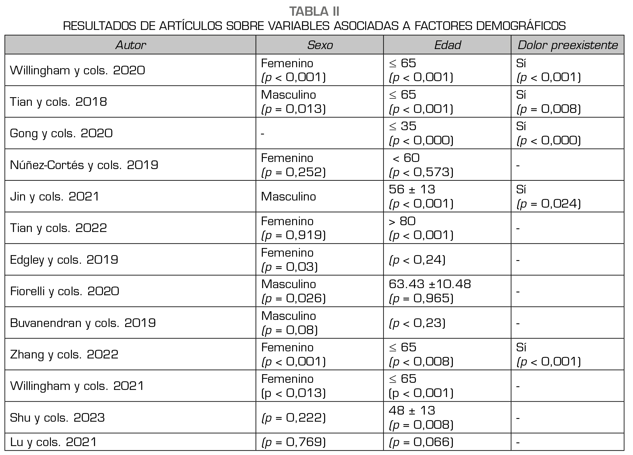 De igual forma, en todos los artículos en los que se refirieron al dolor preexistente, es considerado como un factor de riesgo (7,11,12,13,16).