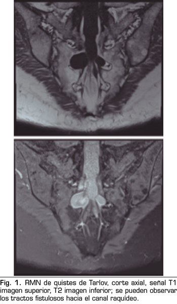 Una de las causas de dolor crónico a tener en cuenta son los “quistes perineurales” o “quistes de Tarlov”. Desde su primera descripción en 1938, son numerosos los artículos en los que se hace referencia. Se trata de lesiones nerviosas que se producen más frecuentemente en la zona sacra (8). En un estudio de Paulsen RD sobre la prevalencia y el drenaje de los quistes de Tarlov, se observó que en 500 pacientes que se sometían a una Resonancia Magnética (RMN) por dolor lumbar, el 5 % presentaba quistes de Tarlov y un 20 % de esos pacientes padecían síntomas relacionados con ellos (9,10). El diagnóstico suele ser casual mediante RMN; la cifra es variable debido a que solo se solicita a aquellos pacientes que presentan dolor lumbar crónico. Dicha técnica es más sensible que la tomografía axial computerizada (11,12).