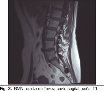 Se realiza una RMN donde no se observan alteraciones estructurales que justifiquen las dolencias que presenta. Como hallazgo casual se describen quistes de Tarlov a nivel de S2. Se solicita una valoración por el servicio de neurocirugía, quienes dudan que la clínica sea consecuencia de los quistes (Figuras 1 y 2).
