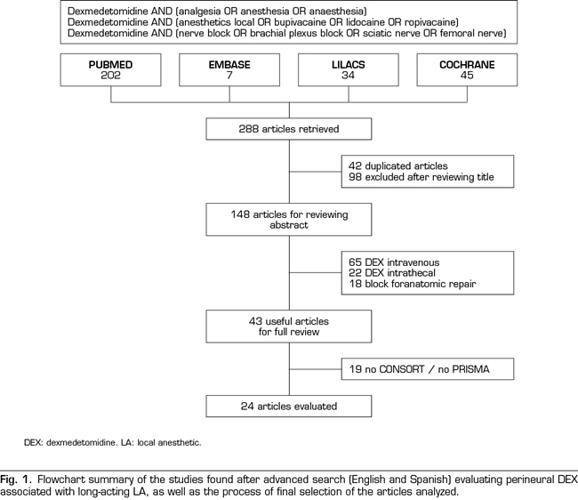 The search engines PUBMED, EMBASE, COCHRANE and LILACS were used. Cross-search strategy using free terms and Medical Subject Headings (MeSH terms) and their respective translation into Spanish (dexmedetomidine; analgesia; anesthesia; nerve block; brachial plexus block; sciatic nerve; femoral nerve; anesthetics, local; bupivacaine ; lidocaine; ropivacaine), Boolean operators (AND, OR and NOT) and review of references recommended by the same publications cited were used.