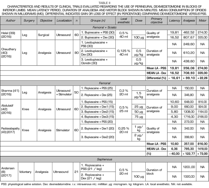 In objective terms, we observed that when using perineural DEX (0.5-2 μg/kg), with long-acting LA, without other adjuvant, in lower limb blocks (femoral, sciatic and/or saphenous nerve), the latency of the blockade was reduced by an average of 41.42% (15.20 to 8.90 minutes), the duration of analgesia increased by an average of 67.84% (487.18 to 834.47 minutes) and the duration of the motor block increased by an average of 107% (545.00 to 1132.25 minutes). However, we must keep in mind when interpreting these results, especially with regard to motor block, that initially spinal anesthesia and/or continuous block catheter was used in several of the analyzed studies (40-43).