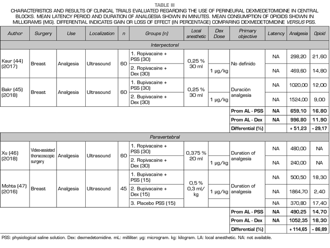 There is very little information available regarding the performance of perineural DEX added to AL in central trunk blocks, not finding to date, and based on the methodology used, more than 10-12 clinical trials in this regard. Table III summarizes the studies found based on the established methodological criteria