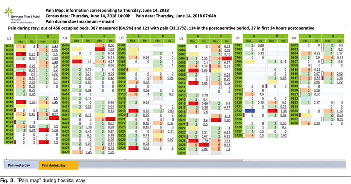 The "Pain map" identifies with different colors as a traffic light of pain. In green color, the EVN values are between 0-3 (mild pain), orange EVN between 4 and 6 (moderate pain) and red color between 7 and 10 (intense pain). Likewise, it indicates with a purple band those patients operated on the previous day, facilitating pain control during the first 24 postoperative hours.