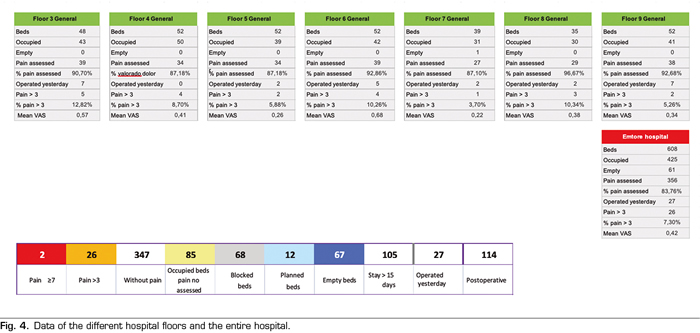The daily visualization of this tool is conducted by the acute pain clinical nurse, identifying those patients with high records of pain, in order to assess the causes and to optimize the analgesic regimen under the supervision of the physician assigned to the unit.
