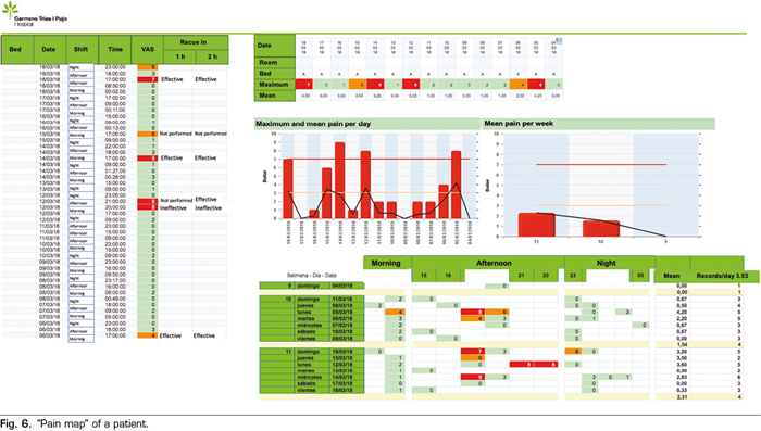 The main variable was the recording of pain intensity using the Visual Analogue Scale (VAS) or Numeric Verbal Scale (NVA) by nursing shift considering pain as the 5th constant. The tool creation procedure was carried out with the collaboration of the hospital information systems department together with members of the Pain Unit for the elaboration of the so-called pain map.