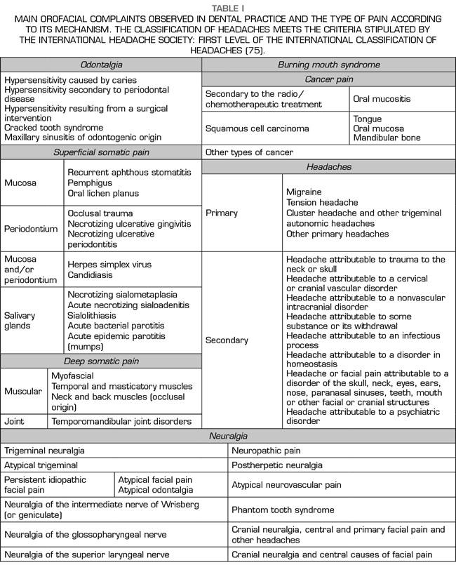 In summary, the main orofacial complaints observed in dental practice and the type of pain according purely to the mechanism of action are shown in Table I.