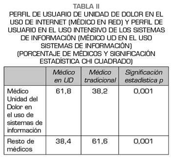Una vez definido el perfil de usuario intensivos en el uso de internet (médico en UD) y en el uso intensivo de los sistemas de información en la práctica clínica (médico unidad del dolor en el uso sistemas de información) hemos comprobado que existe una asociación significativa entre ambos indicadores. Esta asociación nos muestra un porcentaje mayor de lo esperado de médicos en red entre los médicos de unidad de dolor en el uso de sistemas de información.