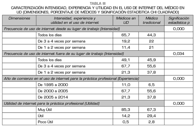 Respecto a la dimensión relacionada con la intensidad, la experiencia y la utilidad en el uso de internet (Tabla III) se constata que existe un porcentaje mayor de lo esperado de médicos en UD entre aquellos que utilizan con mayor intensidad internet (todos los días), tanto fuera como dentro de su trabajo; entre aquellos que tienen una mayor experiencia en el uso de internet, ya que hace más tiempo que están conectados (antes del año 2000); y, por último, entre aquellos que consideran que internet tiene mayor utilidad.