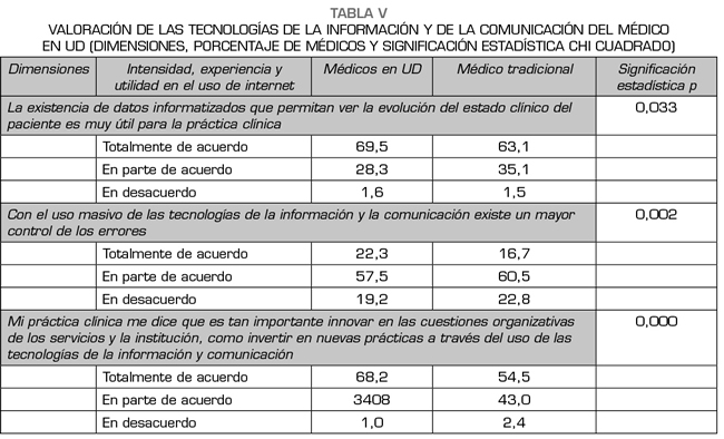 En cuanto a la dimensión relacionada con la valoración de las TIC que realizan los profesionales encuestados (Tabla V) se observa que existe un porcentaje mayor de lo esperado de médicos en red que están totalmente de acuerdo con que la existencia de datos informatizados que permita ver la evolución del estado clínico del paciente es muy útil para la práctica clínica; con que el uso masivo de las Tecnologías de la Información y la Comunicación existe un mayor control de los errores y que es tan importante innovar en las cuestiones organizativas de los servicios y la institución como invertir en nuevas prácticas a través del uso de estas tecnologías.