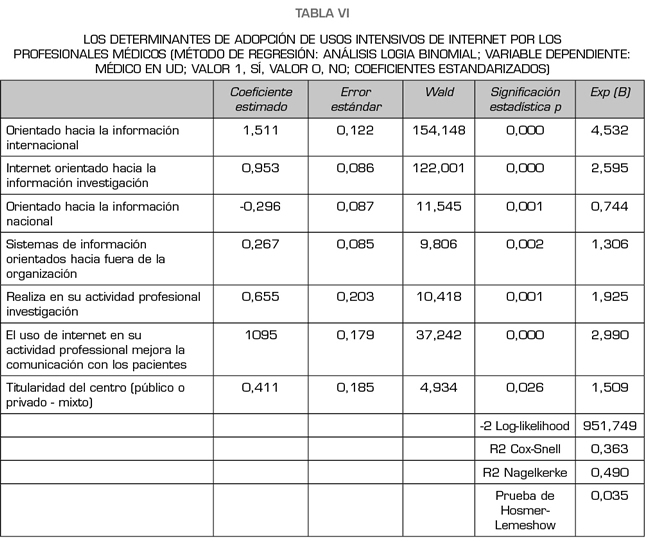 De la estimación del modelo se desprende que todas las variables tienen un poder explicativo muy significativo sobre la adopción de un uso intensivo (médicos UD) de internet. Las relaciones de influencia son positivas, con excepción del factor relacionado con aquellos profesionales que están orientados hacia la información nacional. Así pues, se observa que los factores relacionadas con el uso de la información internacional; el uso de internet orientado hacia la información y la investigación y el uso de los sistemas de información orientados hacia fuera de la organización juegan un papel significativo en la adopción de un uso intensivo de internet. Ese mismo papel positivo lo juega el que los médicos realicen investigación; que consideren que el uso de internet en su actividad profesional mejora la comunicación con el paciente y que realicen sus actividades en centros públicos y en centros privados (titularidad mixta).