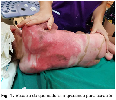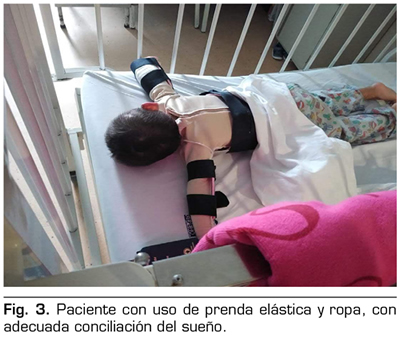 Se hizo seguimiento diario, evidenciando mejoría considerable de prurito, hasta la ausencia de dicho síntoma, permitiendo el uso de ropa, mejoría del sueño, sesiones de terapia física, realización de actividades básicas y jugar (Figura 3). Al mismo tiempo se decide retirar paulatinamente los medicamentos administrados con anterioridad, quedando solo con gabapentina, brindándose posteriormente el alta respectiva. Luego es evaluada por consultorio externo de terapia del dolor, presentando ausencia de prurito, tolerando las sesiones de terapia física y el uso de prenda elástica, decidiendo el retiro completo de gabapentina y el alta del servicio.