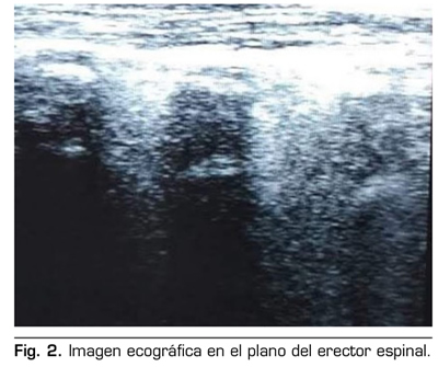 Durante la evaluación diaria por el equipo de la UTDCPP se encuentra un dolor controlado (FLACC 1 a 2 puntos) y persistencia de prurito de severa intensidad en tórax anterior y posterior bilateral, que le impedía la conciliación del sueño, la realización de actividades simples y la colocación de prendas o ropas, decidiendo suspender PCA e iniciar tramadol de 1-1,5 mg/kg horario (cada 6-24 h y la suspensión respectiva), se adiciona amitriptilina de 0,25-0,8 mg/kg/día, se suspende bolos de lidocaína/ketamina y se inicia infusión de lidocaína de 1-1,5 mg/kg/h además de loratadina y clorfenamina horaria, indicada por su médico pediatra tratante. Al realizar el seguimiento respectivo de la paciente se evidencia un FLACC de 1 punto y prurito de severa intensidad en las mismas regiones, decidiendo continuar con la medicación antes descrita e iniciar sesiones de acupuntura, remitiendo parcialmente el prurito. Por ello se plantea en junta médica la realización de una técnica analgésica regional. Teniendo en cuenta que la región afectada era muy amplia y por el riesgo considerable de neumotórax, se descarta el bloqueo de nervios intercostales. Igualmente, la inyecsción torácica epidural o paravertebral se descartó, al considerarse muy invasiva. Finalmente, por su efecto descrito a nivel nociceptivo, neuropático y simpático, se optó por un bloqueo del ESP guiado por ultrasonido, según la técnica descrita por Forero y cols. (5). Paciente bajo sedación, con funciones vitales estables, quien presenta una piel hipertrófica, eritematosa, sin signos o síntomas de infección local, se ubica en posición lateral; usando el transductor lineal de alta frecuencia (5-15 Mhz) se visualiza inicialmente en eje largo la apófisis espinosa de T4, posteriormente se giró el transductor al eje corto, se identificaron 3 músculos superficiales (trapecio, romboide mayor y erector espinal) y con una aguja espinal punta quincke BD® calibre 22G × 3½ pulgadas, se hace la punción en plano con el transductor, en dirección cefalocaudal buscando el plano interfascial superficial a las apófisis transversa de T4. Con ultrasonido se localiza la punta de la aguja en el plano interfascial y se inyecta un total de 0,5 ml/kg de bupivacaína al 0,1 % más dexametasona 0,1 mg/kg, bilateral (Figura 2); el cual se realizó en 3 oportunidades, espaciados por 3 días.