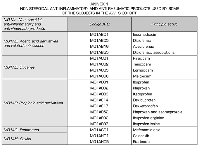 Annex 1 compiles the ATC codes and active principles of all NSAIDs used in 2016 in the AWHS cohort. The pharmacological subgroups belonging to group M01A (anti-inflammatory and nonsteroidal anti-rheumatic drugs) studied were: Acetic acid derivatives (M01AB), oxicams (M01AC), propionic acid and derivatives (M01AE), fenamates (M01AG) and coxibs (M01AH). The M01AX subgroup (other nonsteroidal anti-inflammatory and anti-rheumatic agents) has been excluded from the study, they cannot be considered as NSAIDs because of their composition and mechanism of action.