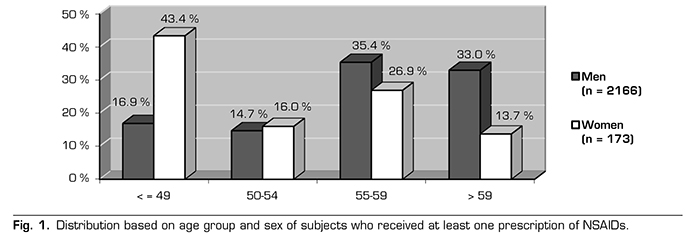 The total number of subjects who received at least one NSAID prescription in 2016 was 2339, of whom 92.6 % were men. A total of 21.3 % of subjects received this prescription during the first trimester of 2016. The median age of the treated subjects was 57 years (interquartile range [IR] = 52-60). Figure 1 represents the distribution of subjects by age and sex groups.