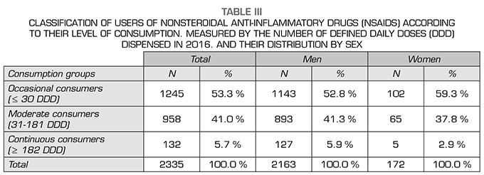 To explore the use of NSAIDs in the group of workers and to classify them by consumer groups, the criterion defined by Helin-Salmivaara et al. (12) was used. This criterion considered as continuous consumers those who used at least 182 defined daily doses (DDD) in one year; consumers between 31 and 181 DDD were classified as moderate consumers. Whereas those with a consumption of less than or equal to 30 DDD formed the occasional consumer group (12). DDD are technical units of measurement defined by WHO as the mean dose, per day, for a drug used for primary indication, in adults (18).