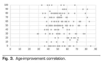 Table 1 shows the diagnoses for the indication of neurostimulator implant. FBSS was the diagnostic indication in 112 patients (62.57 %). Lumbar pain without previous spinal surgery was the diagnostic indication in 18 patients (10.05 %). CRPS was the diagnostic indication in 14 patients (7.82 %). Neuralgia or neuropathic pain was the diagnostic indication in 11 patients (6.15 %). Cervical pain was the diagnostic indication in 7 patients (3.91 %). Pelvic pain was the diagnostic indication in 5 patients (2.79 %). Peripheral vascular disease was the diagnostic indication in 3 patients (1.68 %). Ulcer pain was the diagnostic indication in 3 patients (1.68 %). Headache was the diagnostic indication in 2 patients (1.12 %). Other diagnoses involved the indication in 4 patients (2.23 %). A total of 55.86 % were women (100 patients), whereas 44.14 % were men (79 patients). The mean age of patients undergoing neurostimulator implantation was 53.6 ± 11 years. Figure 2 shows the age distribution by year. The mean age of FBSS patients in the sample was 53.37 years, similar to that of the group with other diagnoses that was 53.65 years. The mean percentage of improvement reported by patients was 47.99 ± 27.3 % at 6 months after implantation of the SCS. The percentage of improvement is not determined by the age of the patients, finding a Pearson correlation index of -0.014 (Figure 3). No differences in improvement have been found between sexes (Figure 4), the mean was 46.9 ± 28 % and 49.3 ± 26.4 % for women and men, respectively.