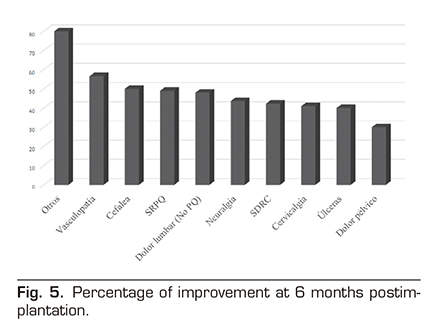 Although several studies (16) show higher rates of improvement than ours, it should be considered that many factors influence (analgesic treatment, psychological condition, type of therapy) that have not been analyzed in this study, and this might be a limitation of this study.