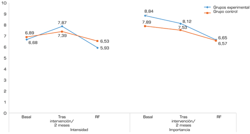 En el grupo experimental, se dan disminuciones significativas en la importancia del dolor en la vida del paciente (F2 = 4,678; p = 0,017). De forma que tras la intervención psicológica (t15 = 3,03; p = 0,008; d = 0,45) y tras la RF (t15 = 2,46; p = 0,026; d = 0,84) disminuye de forma significativa con respecto a la medición basal. En el grupo control no se observan diferencias estadísticamente significativas entre las mediciones (F2 = 1,67; p = 0,208). En la comparación entre grupos no se observan diferencias significativas en ninguna de las mediciones.