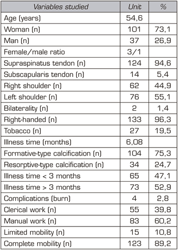 Results: Mean age 54.6 years (n = 138). Female (73.1 %; n = 101); female to male ratio 3:1. Supraspinatus tendon (94.6 %; n = 124), subscapularis (5.4 %; n=14); left shoulder (55.1 %; n = 76), right shoulder (44.9 %; n = 62). Bilateral 1.4 % (n = 2). Right handed 96.3 % (n = 133); Personal history: smoking (19.5 %; n = 27), diabetes (7.2 %; n = 10); disease time averaged 6.08 months; acute-subacute pain (less than 3 months) 47.1; (n = 65), chronic pain (greater than 3 months) 52.9 % (n = 73). Radiological type: formative 75.3 % (n = 104); resorptive 24.7 % (n = 34). Average number of sessions: 20.5. Treatment complications 2.8 % (n = 4): intolerance/erythema/burn. Occupation: administrative 39.8 % (n = 55), manual jobs 60.2 % (n = 83).