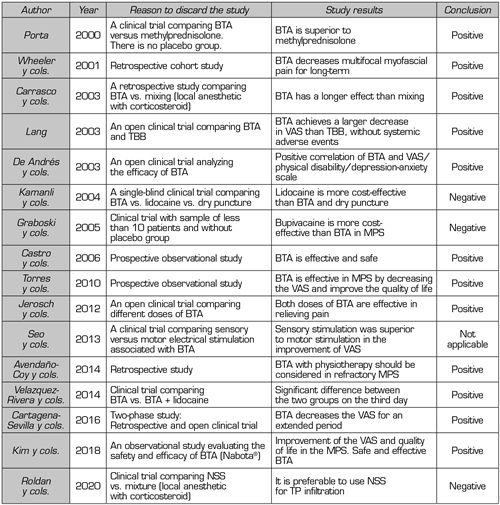 Although the quality of the clinical trials used for this review is very good (they score equal to or above four on the Jadad scale), their analysis is complex because many aspects vary in each study: Design, inclusion criteria, location of TPs, number and location of infiltrations, duration of the study, toxin dose, and method for measurement of results. In addition, not all report whether they maintained routine analgesia, initiation of physical therapy, rescue medication, and other complementary therapies throughout the studies, which poses a major challenge in drawing conclusions about the usefulness of BTA in MPS.