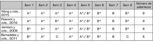 La calidad de los estudios longitudinales se valoró mediante la herramienta Newcastle-Ottawa Quality Assessment Form for Cohort Studies (23). Esta herramienta evalúa la calidad de los estudios a través de 8 ítems agrupados en tres categorías: selección, comparabilidad y resultado. Cada artículo puede tener un máximo de 9 asteriscos, y se consideraron de alta calidad cuando tenían al menos 6 asteriscos (22,24) (Anexo 1).