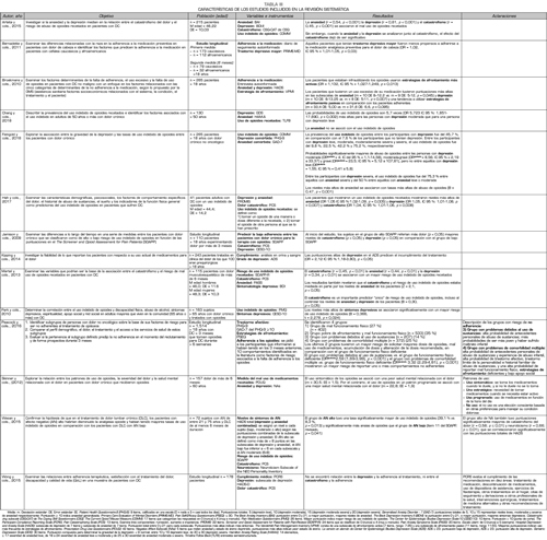 Se identificaron 5 estudios en los que se analizaba la relación entre catastrofismo y adherencia al tratamiento analgésico. En 3 de ellos, se encontró que cuando los niveles de catastrofismo medido con The Pain Catastrophizing Scale (PCS) eran altos, el riesgo de no adherencia o mal uso de opioides era mayor (17,29,36)(Tabla III). Sin embargo, en otro estudio que utilizó el mismo instrumento se observó que el catastrofismo no guardaba relación con la falta de adherencia (34).