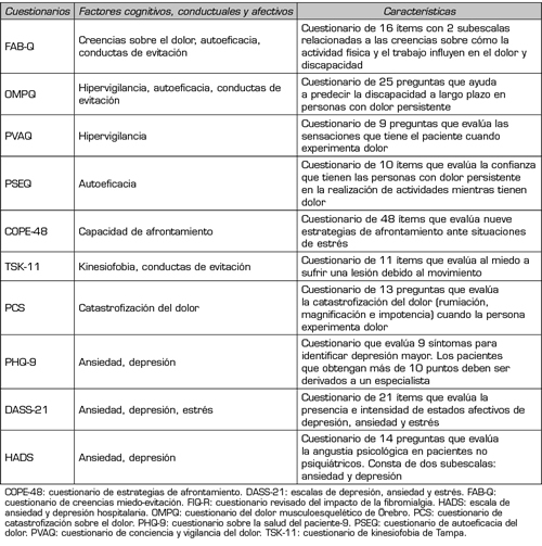 Tabla I. Cuestionarios para la evaluación de factores cognitivos, conductuales y emocionales en la entrevista clínica de personas con FM (37,40,44-50)
