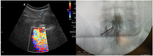 Fig. 2. Inyección de 5 a 10 ml de suero fisiológico con registro de la imagen doppler color, que se distribuye en el canal raquídeo, en una inyección epidural L5S1 paramediana derecha (imagen a la izquierda). Las flechas azules indican el trayecto de la aguja de Touhy. A la derecha se observa la confirmación con epidurograma de una inyección epidural L5S1 izquierda.