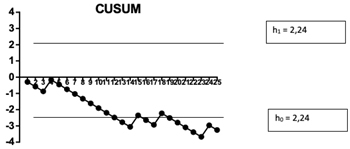 El tipo de test propuesto en nuestro estudio se aplica a conjuntos de datos discretos que toman valores binarios de acuerdo a la ocurrencia o no de un evento (en este caso éxito o fallo de la técnica) y que son recogidos en forma secuencial. La fórmula utilizada en el cálculo del CUSUM se muestra en la Tabla I. La función que define la curva de Cusum en la curva de rendimiento se calcula a partir de las constantes: porcentaje de fallo aceptable (p0) e inaceptable (p1), probabilidad de error Tipo I y II (α y β) a partir de los cuales se calcula el valor de s y los límites de decisión para la hipótesis nula y alternativa h0 y h1 que se mantienen constantes para cualquier valor de la muestra (Tabla I y II). Se tomó como porcentaje de fallo aceptable un 20 % e inaceptable de fallo de 40 % (Tabla II). El error α y β se tomó como 0,1.