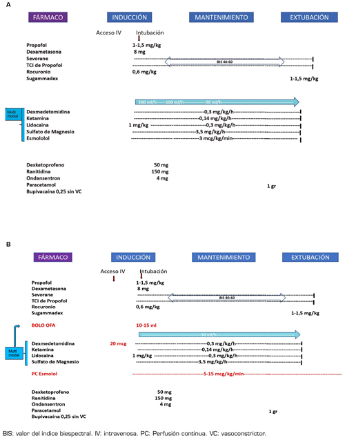 En el periodo inicial hasta noviembre del 2018 se realizaba una dilución conjunta en 250 ml de suero salino fisiológico de dexmedotimidina (100 mcg), ketamina (50 mg), lidocaína al 2 % (100 mg), sulfato de magnesio (1,2 g) y esmolol (60 mg). Esta dilución se iniciaba a 200 ml/h y luego se iba disminuyendo hasta un mantenimiento a 50 ml/h. En la Figura 1A podemos ver el protocolo completo. Posteriormente, este se varió: se iniciaba con un bolo de unos 10-15 ml de la dilución, se había aumentado la dosis de lidocaína al 2 % (se duplicó) y el esmolol se aplicaba en perfusión independiente a un ritmo de 5-15 mcg/mi (Figura 1B).