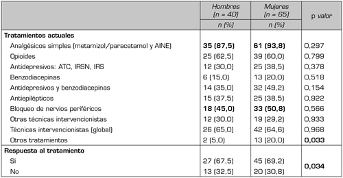Todos los participantes recibían en el momento del estudio algún tratamiento, siendo los más comunes en ambos sexos los analgésicos simples, como tratamiento farmacológico y los bloqueos de nervios periféricos, como técnica intervencionista (Tabla 6). La presencia de múltiples tratamientos concomitantes se dio casi la mitad de los pacientes, ya que el 48,6 % estaba con cuatro o más tratamientos. Esta situación se daba más en mujeres que en hombres (55,4 % vs. 37,5 %), sin ser una diferencia estadísticamente significativa (p = 0,08).