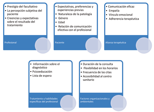 O’Keeffe (63) realiza una metanálisis y una revisión sistemática utilizando 11 bases de datos para analizar aquellas variables contextuales inespecíficas (elementos físicos, psicológicos y sociales que caracterizan el encuentro terapéutico con el paciente con dolor) que pueden influir en el resultado de la intervención, y los clasifica en cinco grandes parámetros: relacionados con el profesional, con el paciente, con la alianza terapéutica, con el tratamiento y habilidades específicas del profesional y aquellos de carácter organizativo y ambiental (Figura 5).