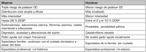 Hace más de 25 años investigadores, epidemiólogos y clínicos del ámbito del DC evidenciaron que hombres y mujeres responden de forma diferente al dolor. Las diferencias fisiológicas, psicológicas o psicosociales pueden hacer variar la expresión, presentación de ciertas patologías y la respuesta a ciertos tratamientos, y ello puede interferir en el diagnóstico y la prescripción del tratamiento (51,52). De hecho, se ha constatado que las mujeres refieren mayor intensidad de dolor, umbral más bajo, distribución más difusa, mayor componente emocional, mayor consumo de fármacos y psicofármacos y peor respuesta al tratamiento convencional. También la tipología que causa el dolor es diferente en función del género: en ellos, la prostatitis crónica, la sensibilidad del suelo pélvico; y en ellas, la endometriosis, adenomiosis uterina, fibromas uterinos, cistitis intersticial y la infección de estructuras ginecológicas. La revisión efectuada por Lamvu y cols., en 2021 (5), refiere que los trastornos dolorosos asociados a suelo pélvico se producen tanto en mujeres como en varones, pero con mayor predominio de las primeras, siendo en hombres la prevalencia de dolor pelviano se ha situado entre 2 % y el 10 %, y en mujeres podría llegar hasta el 28 %.