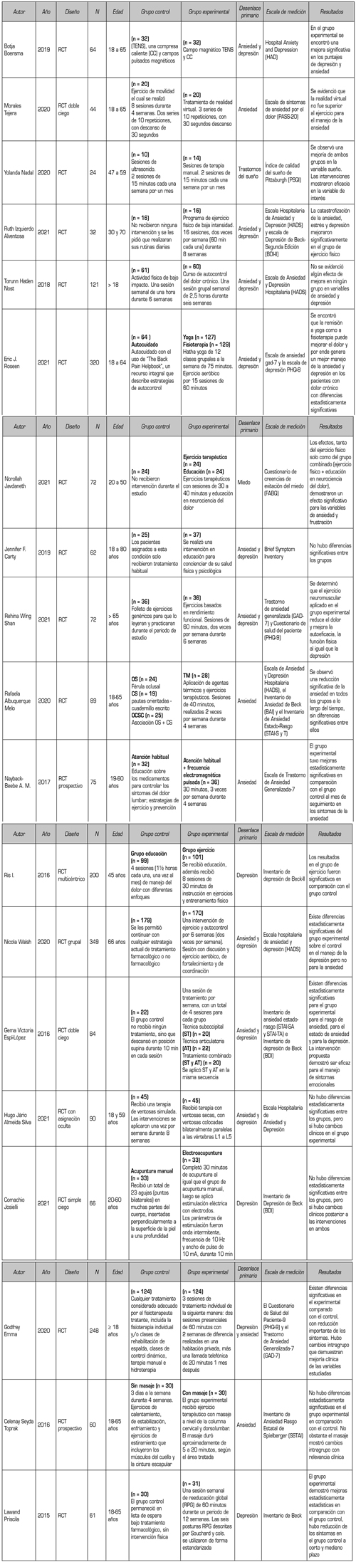 Resultados: En total se incluyeron 20 ensayos clínicos. La revisión sistemática encontró efectos clínicamente significativos en las múltiples estrategias de intervenciones que desde la fisioterapia se emplean para el manejo de ansiedad y depresión en pacientes con dolor crónico.