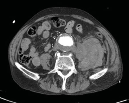 Respecto a las pruebas complementarias, en la analítica sanguínea, se halla una PCR de 39,1 mg/l, leucocitosis de 21.300/mm3, con 88 % de neutrófilos, y una hemoglobina de 10,5 g/dl. En la radiografía pélvica no se evidencian hallazgos patológicos. Debido a la hipotensión, se decide realizar un TC abdominal (Figuras 1 y 2), en el que se objetiva un aneurisma de aorta infrarrenal roto, con diámetro de 50 x 52 x 48 milímetros, a 50 mm de arteria renal derecha y a 65 mm de arteria renal izquierda, craneal a la bifurcación ilíaca. Asimismo, se aprecia un hematoma retroperitoneal en contexto de sangrado en parte posterior de la aorta, que infiltra el músculo psoas ilíaco izquierdo, justificando la clínica de coxalgia con irradiación izquierda. Se contacta con cirugía vascular, interviniéndose de forma urgente, con buena evolución posterior.