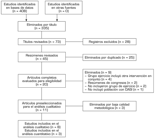 Inicialmente se obtuvieron 408 artículos, de los cuales 8 fueron elegibles para ser incluidos en la revisión y hacer parte de la síntesis cualitativa de datos (16,17,18,19,20,21,22,23). En la búsqueda realizada en la lista de ensayos no publicados de clinicialtrial.gov se obtuvieron 7 registros de estudios en población con disfunción sacroilíaca, pero ninguno de ellos evaluaba la aplicación de alguna modalidad de ejercicio terapéutico. La Figura 1 presenta el flujo de los estudios a lo largo del proceso de selección.