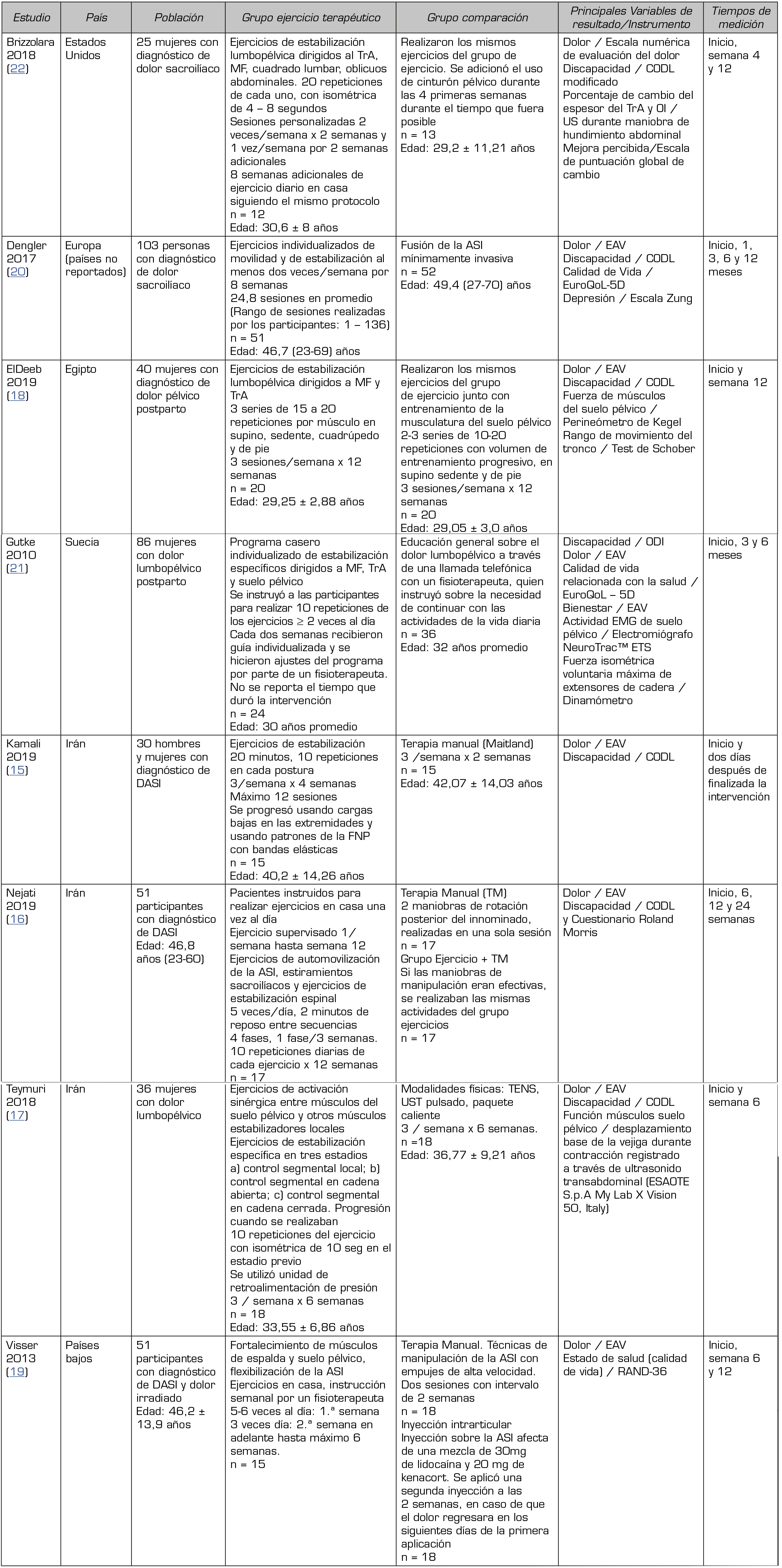 Los estudios analizados compararon la realización de ET frente a intervenciones como la terapia manual (TM) (16,17,20), la fusión quirúrgica de la ASI (21), la educación sobre el dolor lumbopélvico (22) y las modalidades físicas (18). Dos estudios compararon la realización de ejercicios de estabilización frente a los ejercicios de estabilización combinados con otro tipo de intervención (16,17,18,19,20,21,22,23). La duración de la intervención con ejercicio terapéutico osciló entre 4 y 12 semanas.