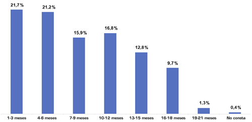 Fig. 1. Distribución del tiempo desde el primer síntoma de COVID-19 hasta la inclusión en el estudio. Esta gráfica muestra la distribución de los supervivientes de la COVID-19 incluidos conforme a categorías de tiempo entre el primer síntoma de COVID-19 y la inclusión en el estudio.